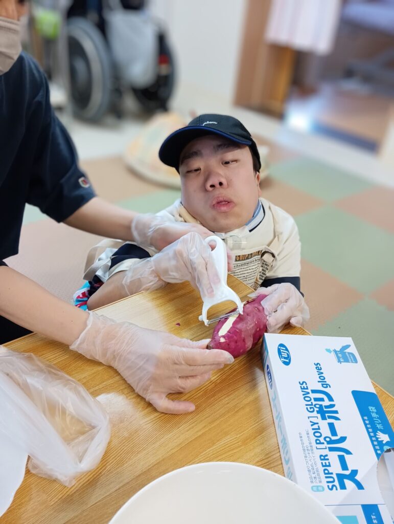 え〜るのお兄さんお姉さんにサツマイモの皮剥きと生地作りをしてもらい、ふわふわの子達にこねこね形成してもらいオーブンで焼き上げて完成✨️