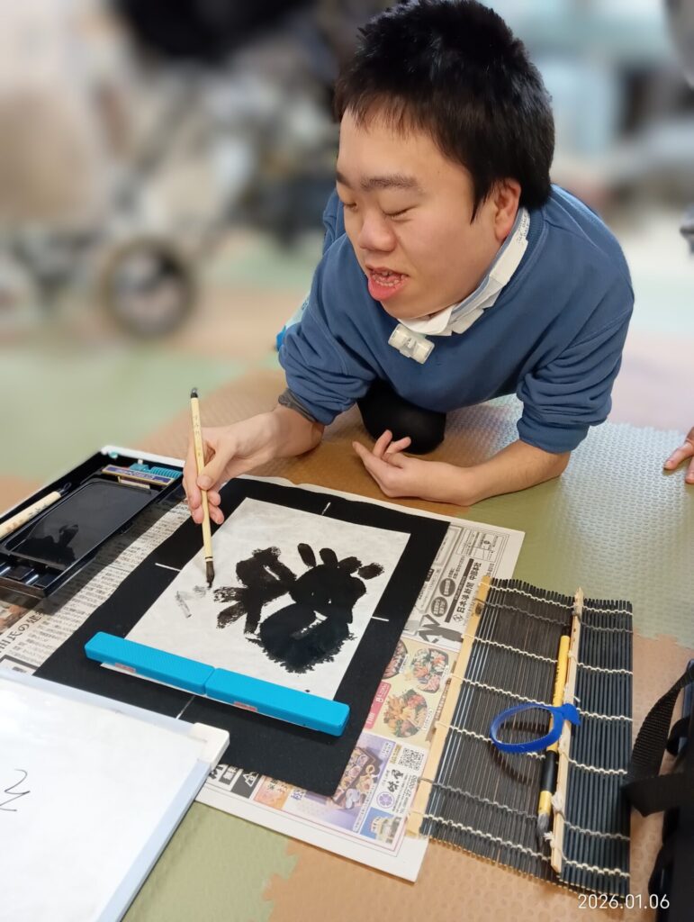利用者様の好きなものや今年の抱負を筆と墨を使って半紙に書いていただきました!