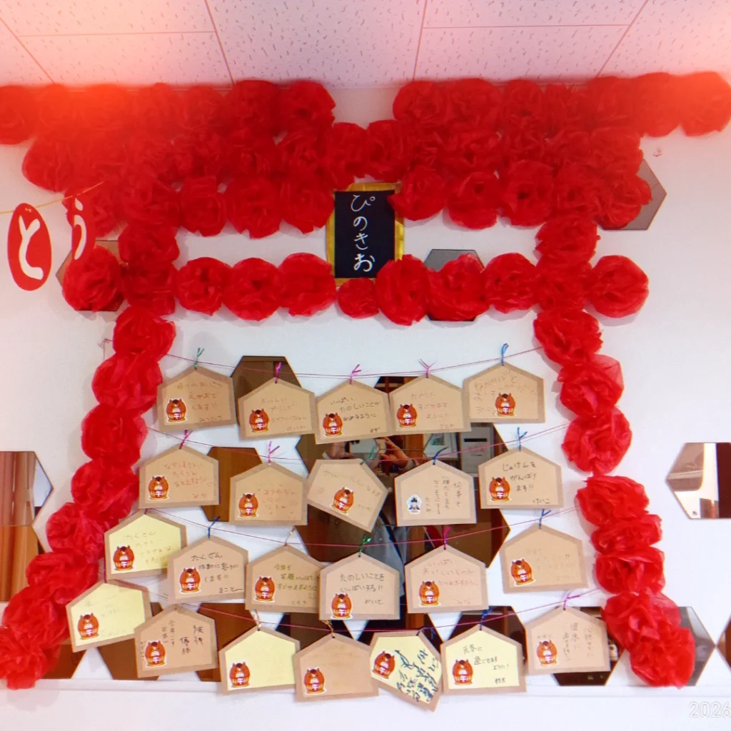 壁に大きな鳥居を作り、ぴのきおの神社に絵馬を飾りました。